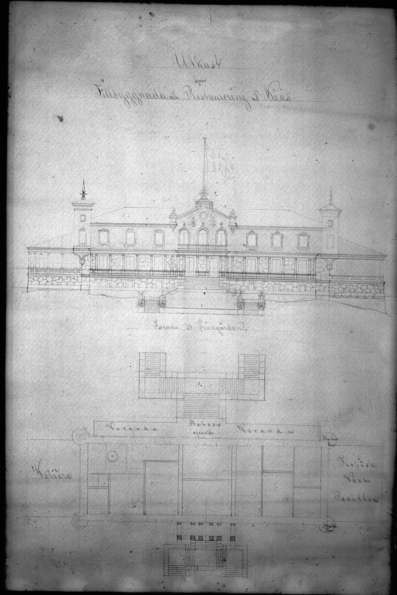 Ritning Nääs. Utkast över tillbyggnader och restaurering vid Nääs. Fasad åt trädgården.
