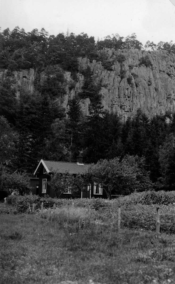 Västra Tunhem sn. Ättestupan, Halleberg. På slätten framför boningshuset låg den numera torrlagda "Odins dam" neg 1435 b Foto: Gustaf Ewald 1926 Vänersborgs Museum.