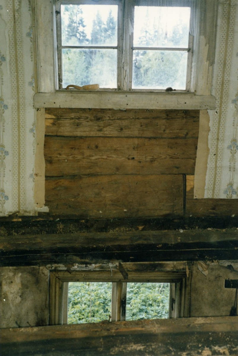 Trasiga golvplankor så två våningar syns i bild, två fönster på olika våningar. Före renovering? Stegerhult Liared