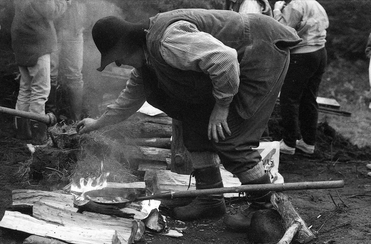 Vargön, Hunneberg. Kolmilan på Erdalen. Matlagning vid kolarmilan.