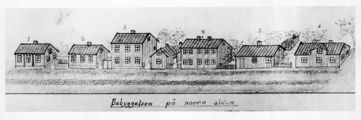Teckning. Kronogatan mellan Vall- o Kyrkogatan. Bebyggelsen på norra sidan Vänersborg