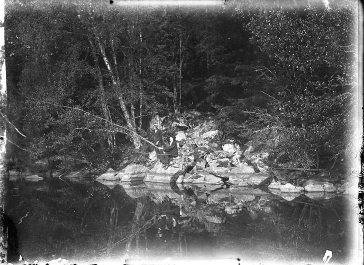 Två män vid vatten, möjligtvis fiskande med långa grenar.