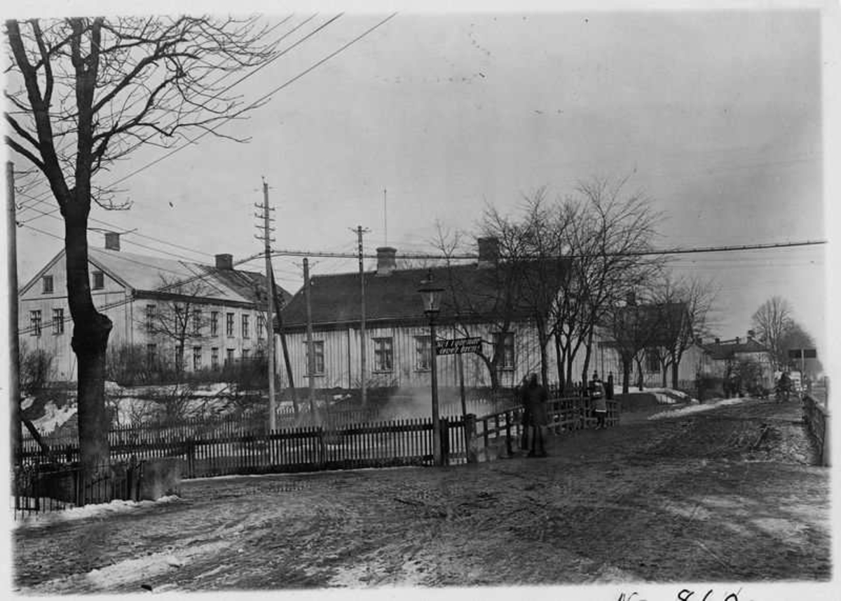 Bron över järnvägen. I bakgrunden fd Börgessonska fastigheten vid Edsgatan 2. Ägare: U W H järnväg. Vänersborg