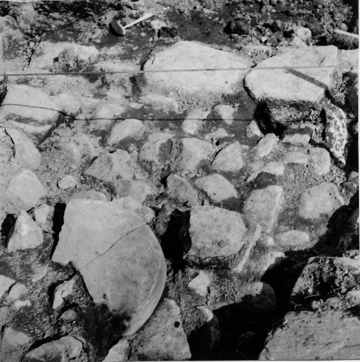 Lödöse. Eldstad och stensatt golv i den mindre byggnaden från utgrävningarna 1958. Neg 1351 g. Foto: Vänersborgs Museum.