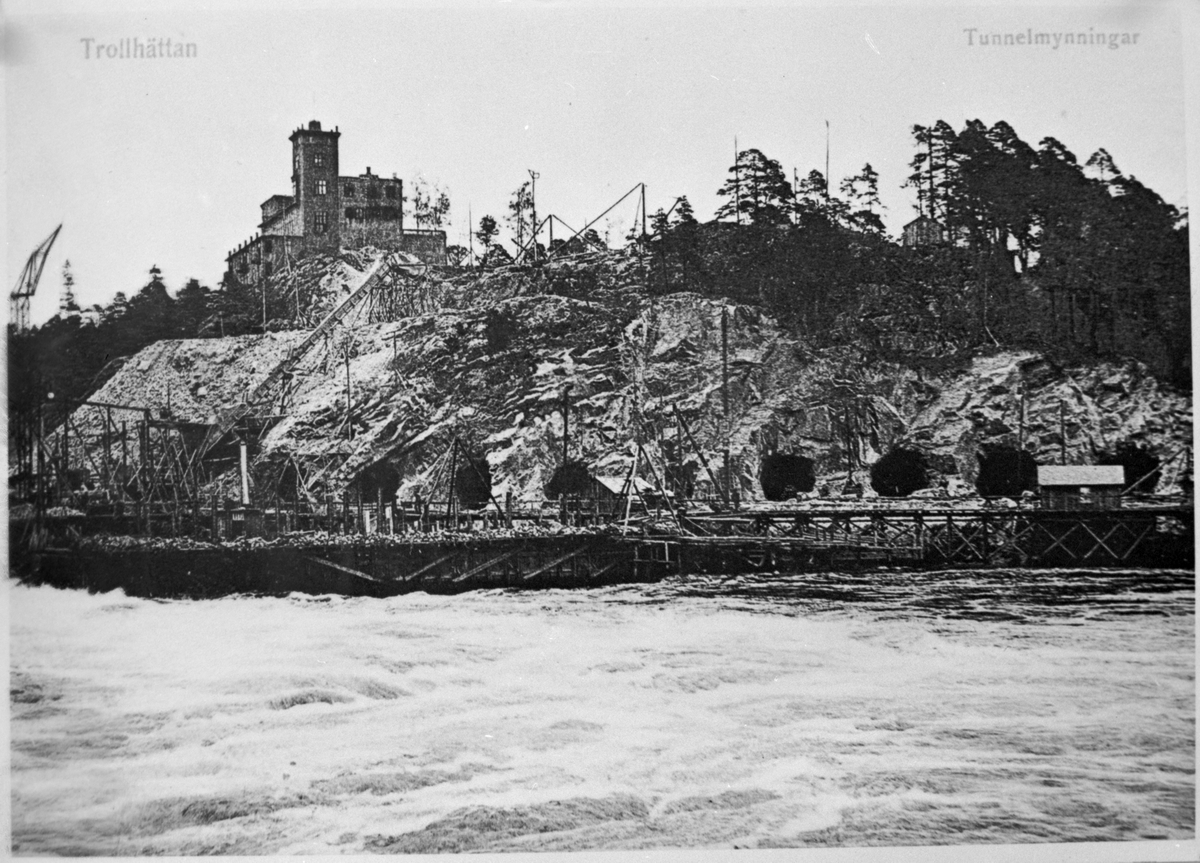 Olidans kraftstation under byggnad. (Tunnelmynningar) Vykort. Trollhättan