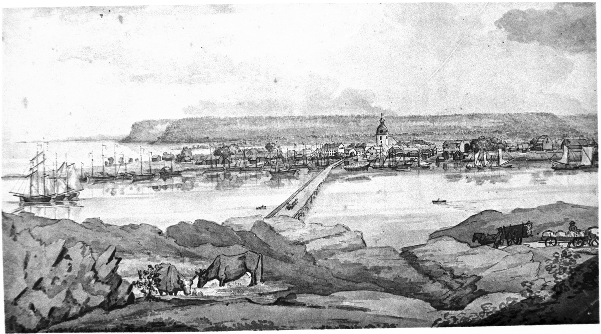 Vänersborg vid början av 1800-talet. Akvarrellerad och laverad blyertsteckning, troligen av L W Kyhlberg den äldre, Såtenäs.