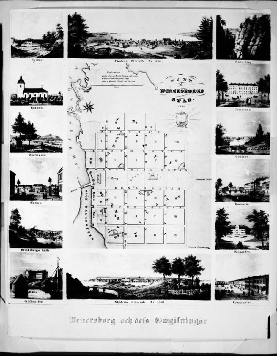 Karta med F A Zettergrens teckningar. Vänersborg med dess omgivningar.