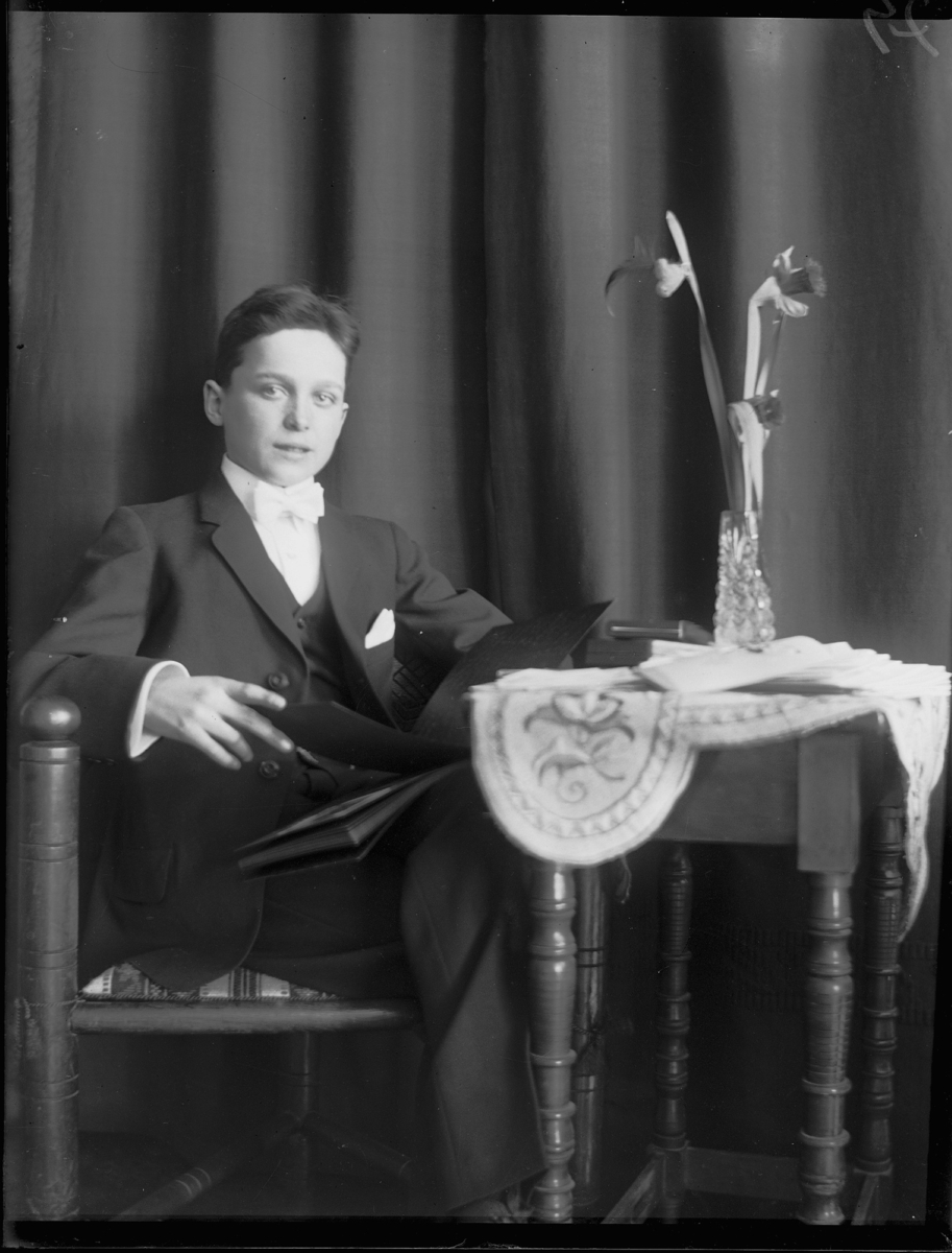 Sveagatan 16. Harry Gudmundsson vid ett bord med blomma.