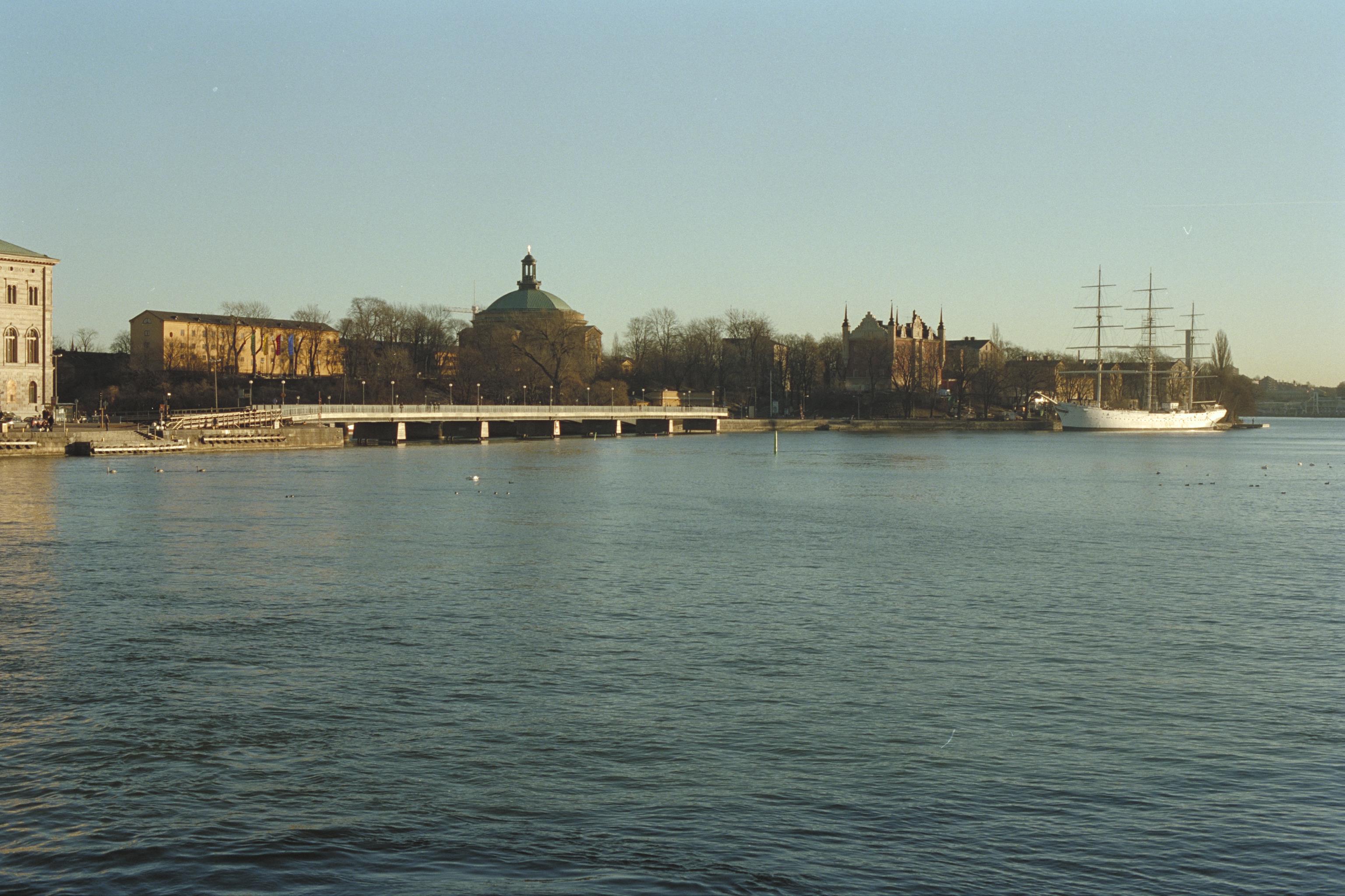 Båten af Chapman, Skeppsholmsbron, Östasiatiska museet samt Skeppsholmskyrkan.