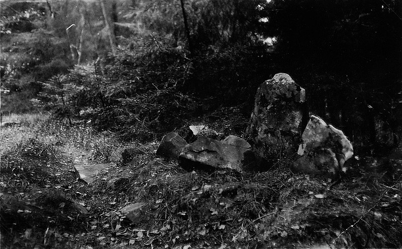 Västra Tunhems sn. Stående sten 90 cm. de andra 3 mindre. Beläget ung 400 m. SV uppfarten i kleven till Bergagården i rasbrotten. Foto: Vänersborgs Museum.