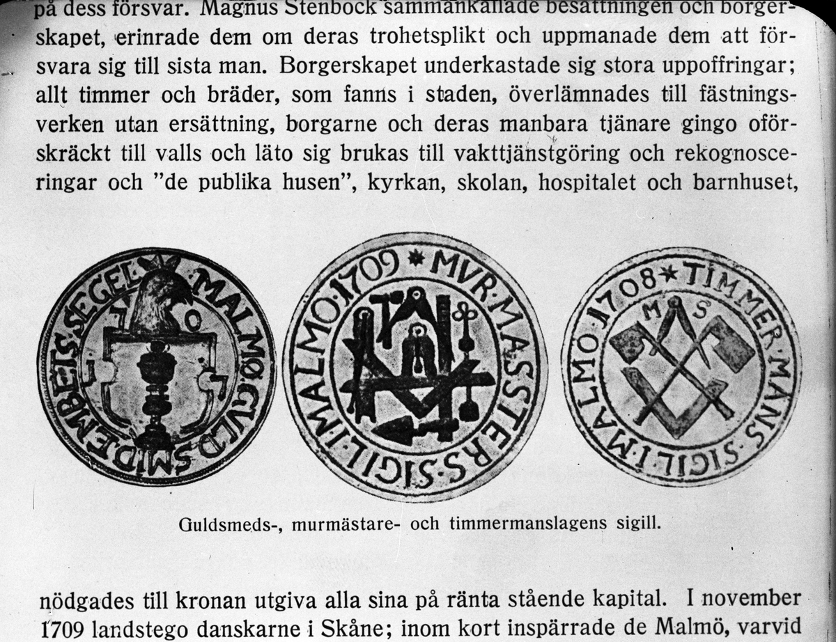 Titel:Sigill Malmö guldsmed, murmästare och timmermanslag.