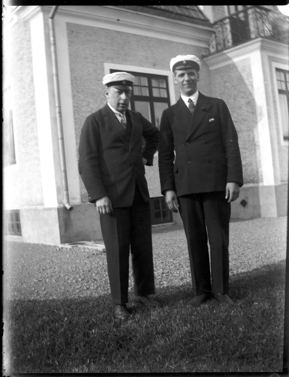 Utanför Johansons hus vid Ringvägen. En manlig vikarie och jag i sångarmössa.