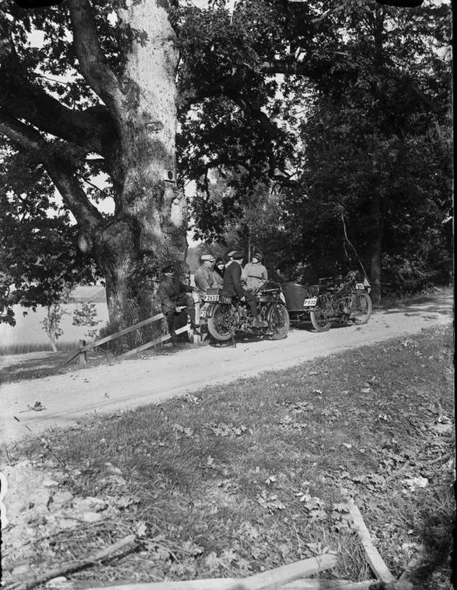 Liten grusväg. Sex personer i samspråk vid två motorcyklar.