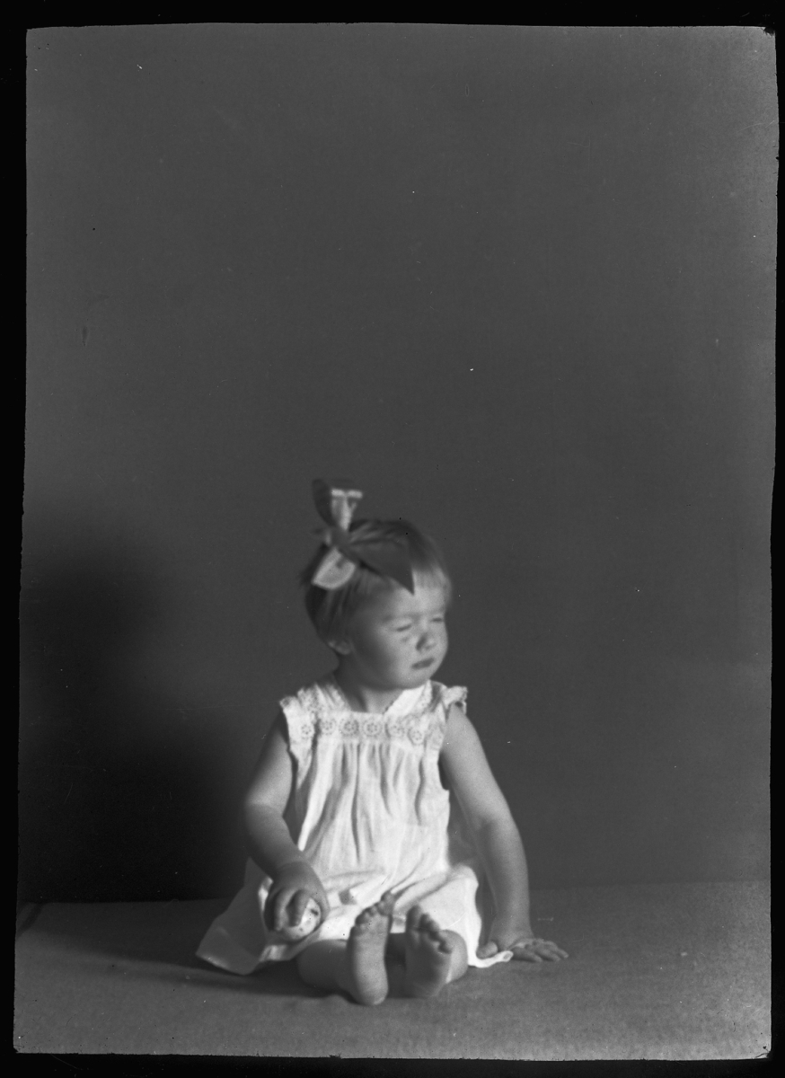 Lilla Gunhild.Sittande flicka. Fondporträtt. Taget med stativkamera. Blixtljus.