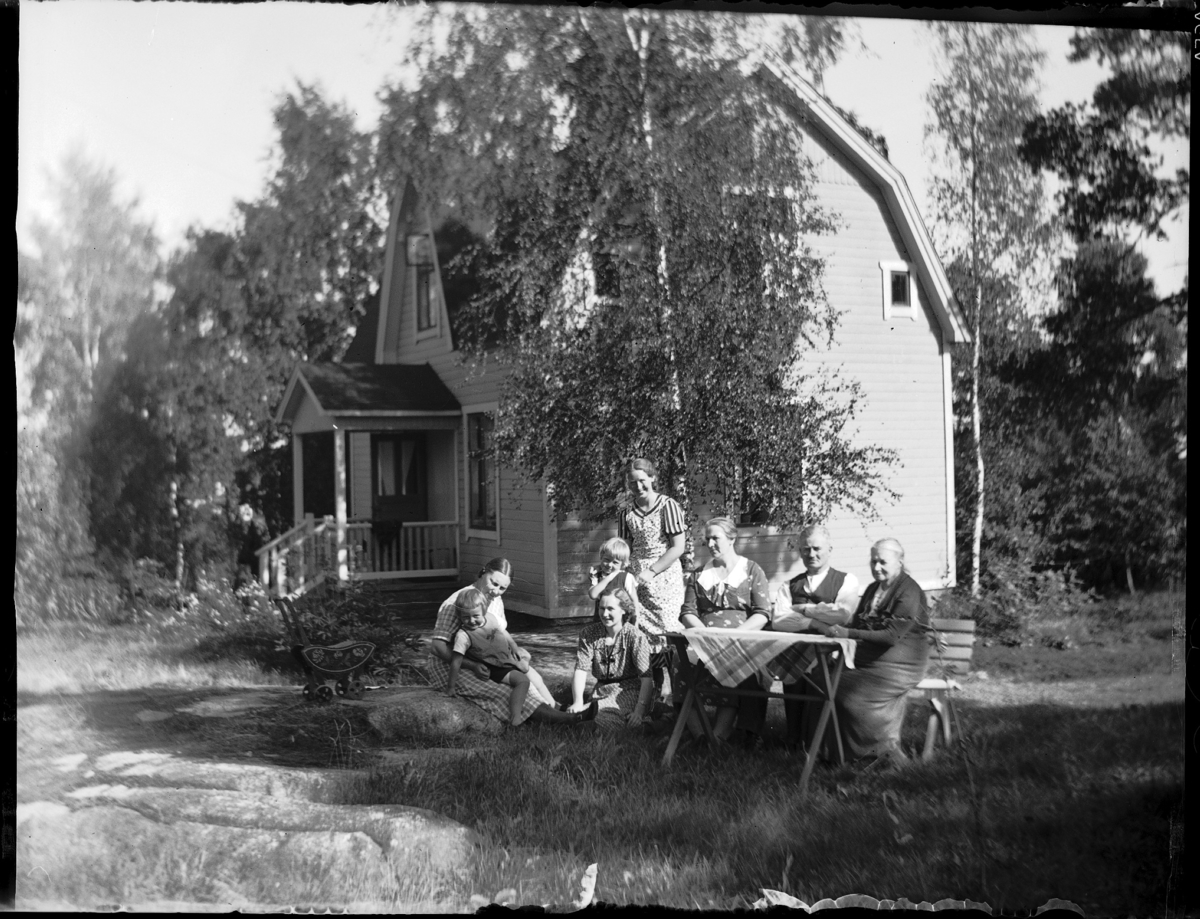 Annelund 27 A. Grupp vid kaffebordet framför Morbror Oskars hus.