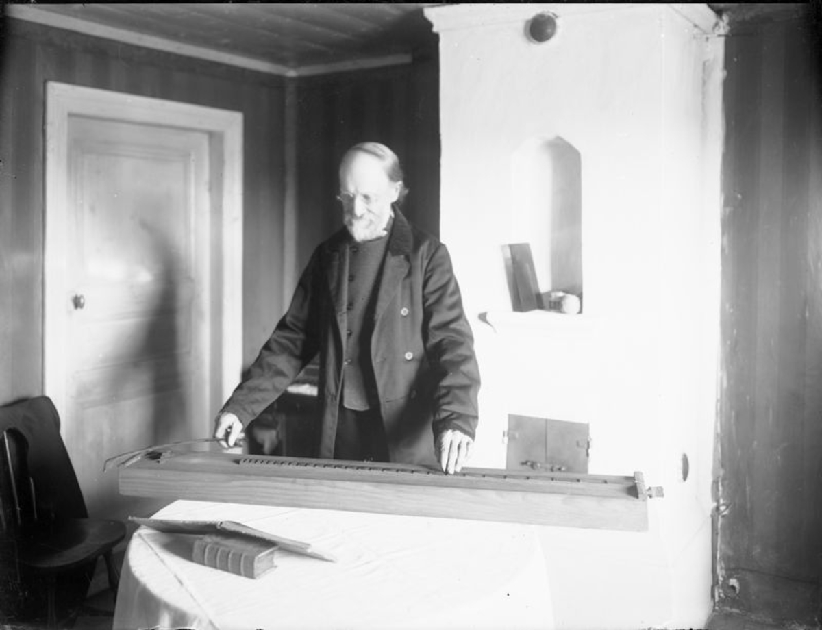 Johannes Andersson spelar på sitt eget hemgjorda psalmodikon Hudene
