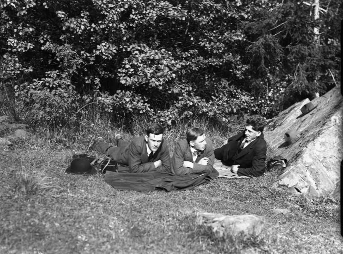 Tre män ligger i gräset.