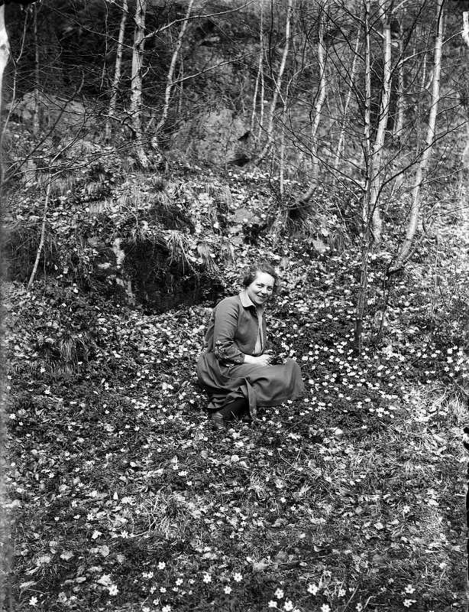 Kvinna omgiven av vitsippor.