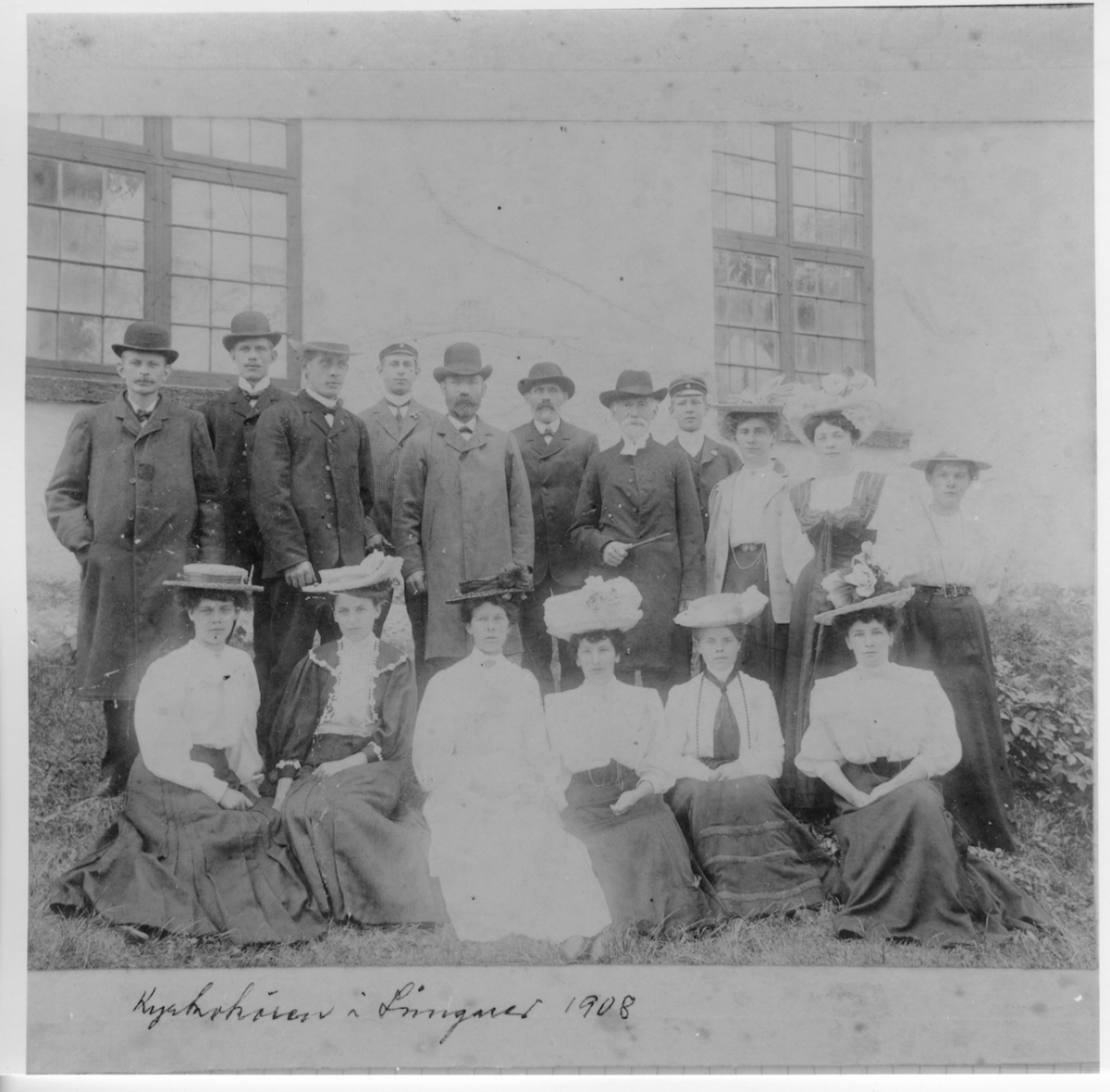 Kyrkokören i Långared. Kvinnor och män placerade vid kyrkan.