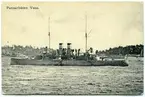 H. M. Pansarbåt Vasa Imp. Axel Montelius JLUSTR Aug. Bellander Hamburg [på baksidan har C. G. Jackson skrivit:] "Passerade Ytterslängan kl 1120 fm. lördagen den 1 augusti 1914."