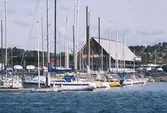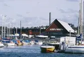 Albin Nova i Fiskebäcks hamn. Representant från Albin Marin i sittbrunnen. I bakgrunden Albin Marins anläggning.