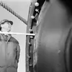 'Kattegatt-expeditionen medlemmar på ''Skandia'', på däck vid kaj i stad. Fr.v. Sune Swärd (andre från vänster i främre raden), Gösta Hyle, Harald Alander (vänster om Jägerskiöld?) och Leonard Axel Jägerskiöld (längst till höger). Styrhytt, avgasrör.'