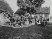 Motiv på Severin Nilsons Björsgård i Asige. Ett yngre par vid ett hästekipage med en äldre kvinna i vagnen, möjligen Severins mor Neta Beata, framför en lada av skiftesverk. Det är södra längan på Björsgård och till höger skymtar vårdträdet med stenfot.