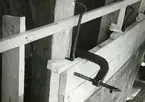 Sjötorps varv. "Sätta till en bordvägsgång" på backen till isländskt fiskefartyg under byggnad. Bordet pressas in med hjälp av en "bändhake" och fästes med tvingar.