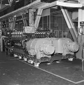 Sjöhistoriska museets permanenta utställning fotograferad 1987. Monter med ångmaskinanläggning för medelstort handelsfartyg. I monter till vänster i bakgrunden en diselmotormodell, Göta-verkens diselmotor 1957.