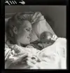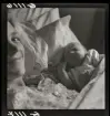 513 B Red. Karlströmer. En bebis sitter i knät på en kvinna och sträcker sig efte ren blombukett på bordet.