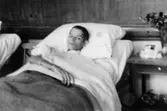 "Karantänsförläggning" på Kvarnbyskolan för flyktingar från koncentrationsläger i Tyskland 1945. En manlig flykting som ligger i en sjuksäng.