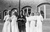 "Karantänsförläggning" på Kvarnbyskolan för flyktingar från koncentrationsläger i Tyskland 1945. En manlig flykting med fem sköterskor.