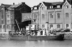 Gävle hamn. Gävleån. Foto från södra mot östra hamnpiren. Rospiggskutan "Valborg" lossar famnved vid Gävleåns kaj. De första hamnanläggningarna var belägna på ömse sidor om Gävleån. Skepparen på "Valborg" hette Kalle Larsson och bor nu (1970) på Eskön. Se SSHM-Arkivet, 1970: 167-184, bildbeskrivning. Fotot är en detalj av foto nr. 1. Foto ca 1905.