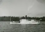 Gustavsbergsbåt vid kajen. Statbyggningen och Ekensberg till vänster, Värdshuset till höger i bakgrunden och Gula byggningen skymtar till höger.