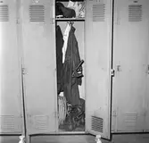 Till vänster ses klädskåp i en korridor, August Werners fabriker i Lindome, hösten 1994.