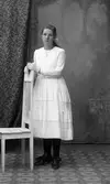 Foto av en okänd kvinnlig konfirmand i lång vit konfirmationsklänning.