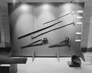 "Vallonien på Louis De Geers tid och idag" utställningen. Redskap. Smältslev, skovel, raka, krok, smältartång, tackjärnsgös.