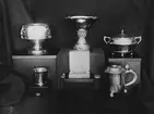 Från firandet av KSSS 125-årsjubileum tisdagen 19 juli 1955 i Gyllene salen i Stockholms stadshus. Fr v t h i främre raden ses två oidentifierade personer (nr 2 troligen prinsessan Ragnhild av Norge), därefter prins Bertil, prinsessan Margaretha av Danmark och kronprins Olav av Norge.