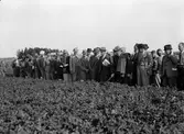 "Bättre rödklöverstammar - bort med ogräset, motto på Ultunakurs" - kursdeltagare studerar klöverodling, Lantbrukshögskolan, Ultuna, Uppsala juli 1942