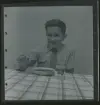 Skolchef Per Thorstensson visar skolan för blivande elever. Barnen kommer från lekskolan. Ett besök i skolbespisningen ingår. Barnen sitter vid flera bord och äter. De har mjölk i glasen.