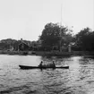 "Några E-kanoter från Ålstens Båt Sällskap omkring år 1950" "Motorbåten i bakgrunden troligen Allan Rosengrens" "Den vita E-kanoten troligen 'Hjorten'"