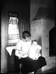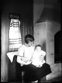 Ett litet barn står vid en låda och leker med en trähund. På golvet ligger vävda trasmattor och på väggen hänger en broderad paradhandduk.