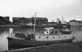 Skåne, Torekov, hamnplanen väster om inre hamnen. I bakgrunden livräddningsbåtens hus, en paragrafbåt och en gammal passagerarslup "MAX". I Förgrunden 3 skånesnipor och en båt av obestämbar typ. Juni 1962