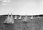 "Stockholm den 30-7. Sandhamnsregattan. En bukett kuttersmycken. Fr.v: Alice Greisz, Aina Bährne, Dagmar Detthoff, Bibbi Berg och E. Frunk."