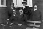 Familj med tre små barn sittande i trädgårdssoffa, 1920-tal
