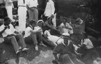Björn Ubbe, i bildens mitt, bedrev ungdomsverksamhet med inriktning på båtbyggeri och snickeri på Kattholmen. Den lilla båt som sjösätts är en kopia i halv skala av Singösnipan Elvira. Personer: Björ Ubbe och okända