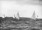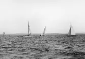 Från starbåtarnas uttagningsseglingar i Sandhamn 21 juni 1936 till OS-seglingarna i Kiel i augusti. Svenska Seglarförbundet hade uppdragit arrangemanget av dessa uttagningsseglingar åt KSSS. De båtar som kan identifieras på bilden är Daniel Sundén-Cullbergs 915 SUNSHINE i förgrunden t v samt Dag Sundén-Cullbergs 1014 MOONSHINE längst t h