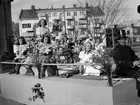 "Vårdrottningen på sin vagn med uppvaktande 'vårblommor", Barnens Dags-ekipage utanför Vaksalaskolan, Vaksala torg
