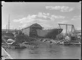 Småland, Kalmar län, Södra Möre härad, Söderåkra socken, Djursvik. Fredrik Jonssons varv. Båtbyggnadsskjul. I bakgrunden ett vrak för upphuggning