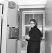 En man stämplar in/ut vid en stämpelklocka på fabriken Soab Berol Kemi i Mölndals Kvarnby, år 1977.
